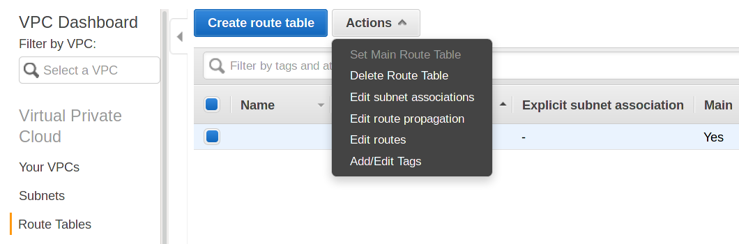 - When logged in to your AWS account, go to Services->VPC->Route Tables