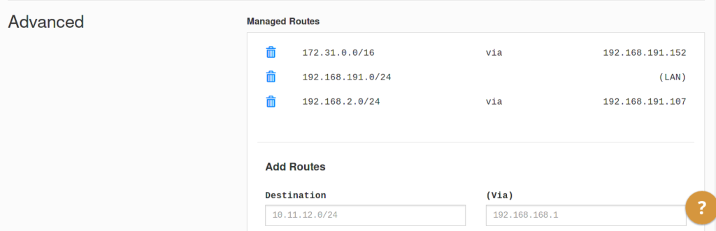 You will need to add static route information so your home router knows the proper pathway for sending packets to your AWS account via the ZeroTier gateway device. Each router is going to be different here so I can only give you an example of the routes used for my setup. You will have to figure out where the settings can be changed on your own device.